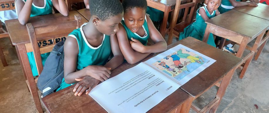 Titelbild: Schüler von Wamanafo lesen Informationsmaterial zum Thema gewaltfreie Erziehung. © PAORP-VWC